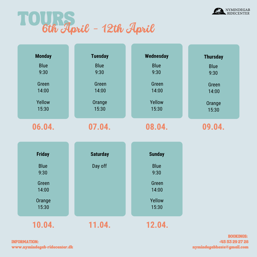 Ved vores stald hænger en opslagstavle, hvor du finder den tur, der passer til dig. Tilmeld dig på tavlen, via telefon eller til en af vores guider.